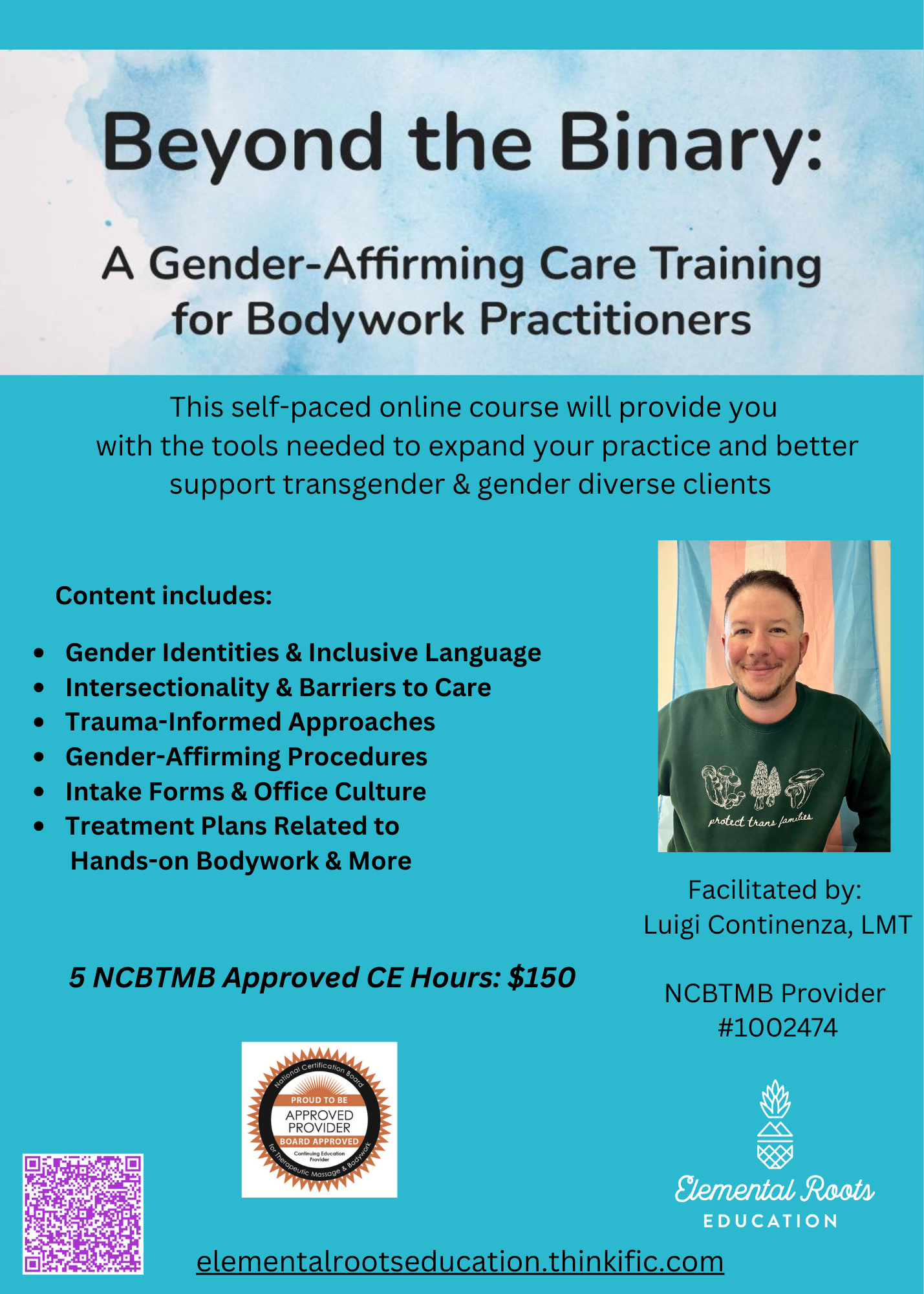 The environment I cultivate is gender-affirming, trauma-informed and body-positive using a variety of massage styles tailoring a unique experience for each individual. I enjoy working with all people including marginalized populations with intersecting identities, some of which are: queer, trans, gender diverse, BIPOC, disabled, LGBTQI+ and a myriad of other communities who have historically dealt with systemic oppression.